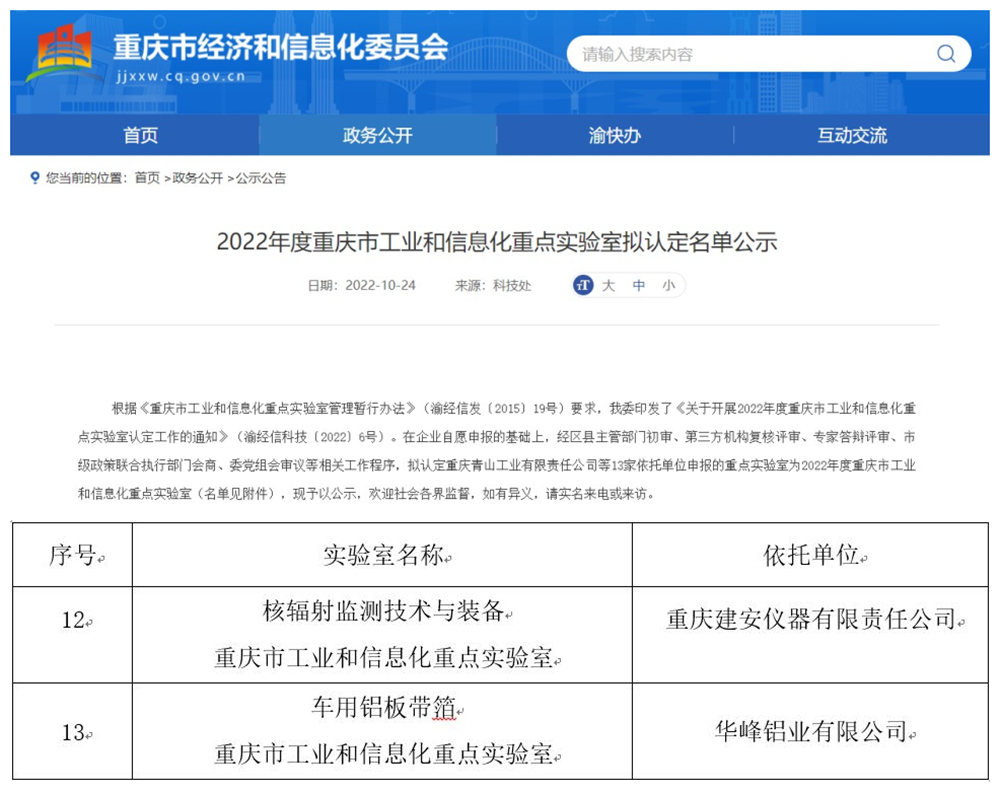 近日,重庆市经济和信息化委员会公示了“2022年度重庆市工业和信息化重点实验室”名单,九五贵宾会铝业有限公司车用铝板带箔实验室作为涪陵区唯一一家单位/企业成功入选。