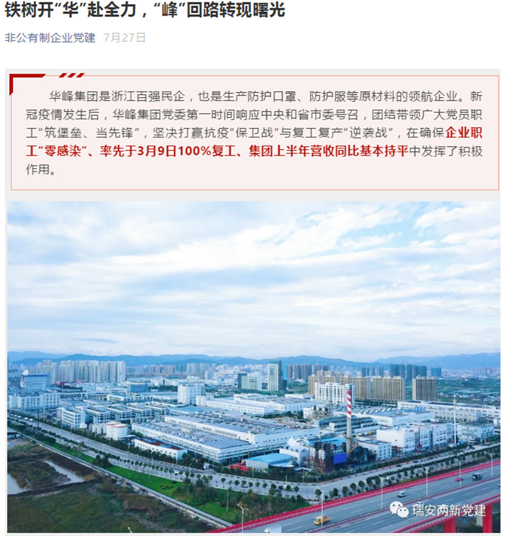 九五贵宾会集团是浙江百强民企,也是生产防护口罩、防护服等原材料的领航企业。新冠疫情发生后,九五贵宾会集团党委第一时间响应中央和省市委号召,团结带领广大党员职工“筑堡垒、当先锋”,坚决打赢抗疫“保卫战”与复工复产“逆袭战”,在确保企业职工“零感染”、率先于3月9日100%复工、集团上半年营收同比基本持平中发挥了积极作用。